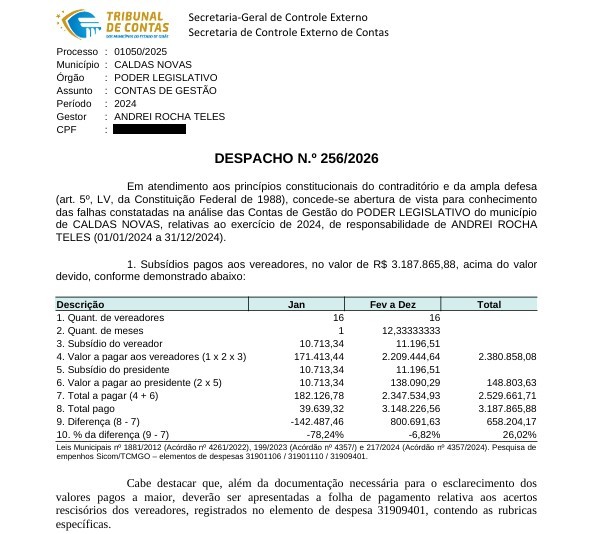 Um relatório técnico do Tribunal de Contas dos Municípios de Goiás (TCM-GO) acendeu um alerta vermelho sobre a gestão financeira da Câmara Municipal de Caldas Novas. De acordo com o Processo nº 01050/2025, o órgão identificou que, ao longo de 2024, foram pagos R$ 658.204,17 a mais em subsídios aos vereadores, valor considerado irregular e acima do permitido pela legislação.