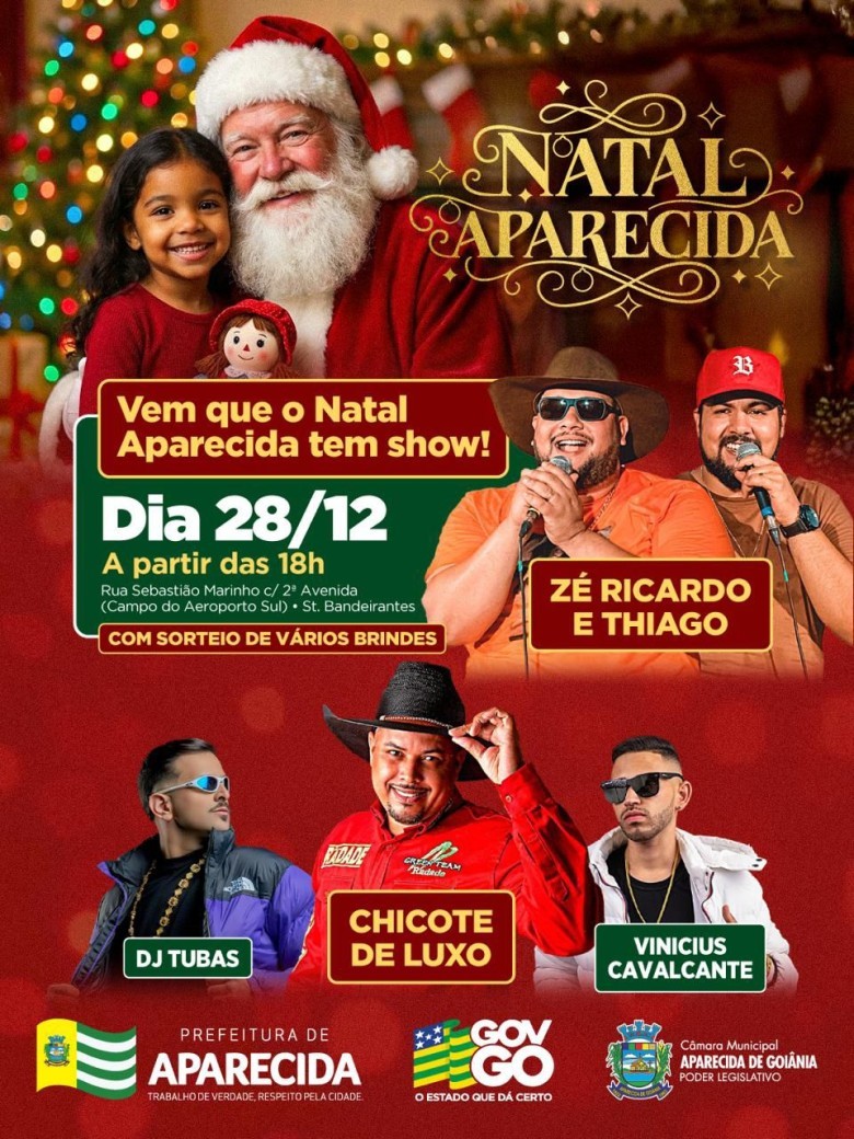Os shows deste domingo do Natal Aparecida integra o calendário de ações culturais e festivas promovidas pela Prefeitura, com apoio do Governo de Goiás e da Câmara Municipal, com o objetivo de descentralizar as atividades culturais, fortalecer o lazer comunitário e levar momentos de confraternização aos bairros da cidade.