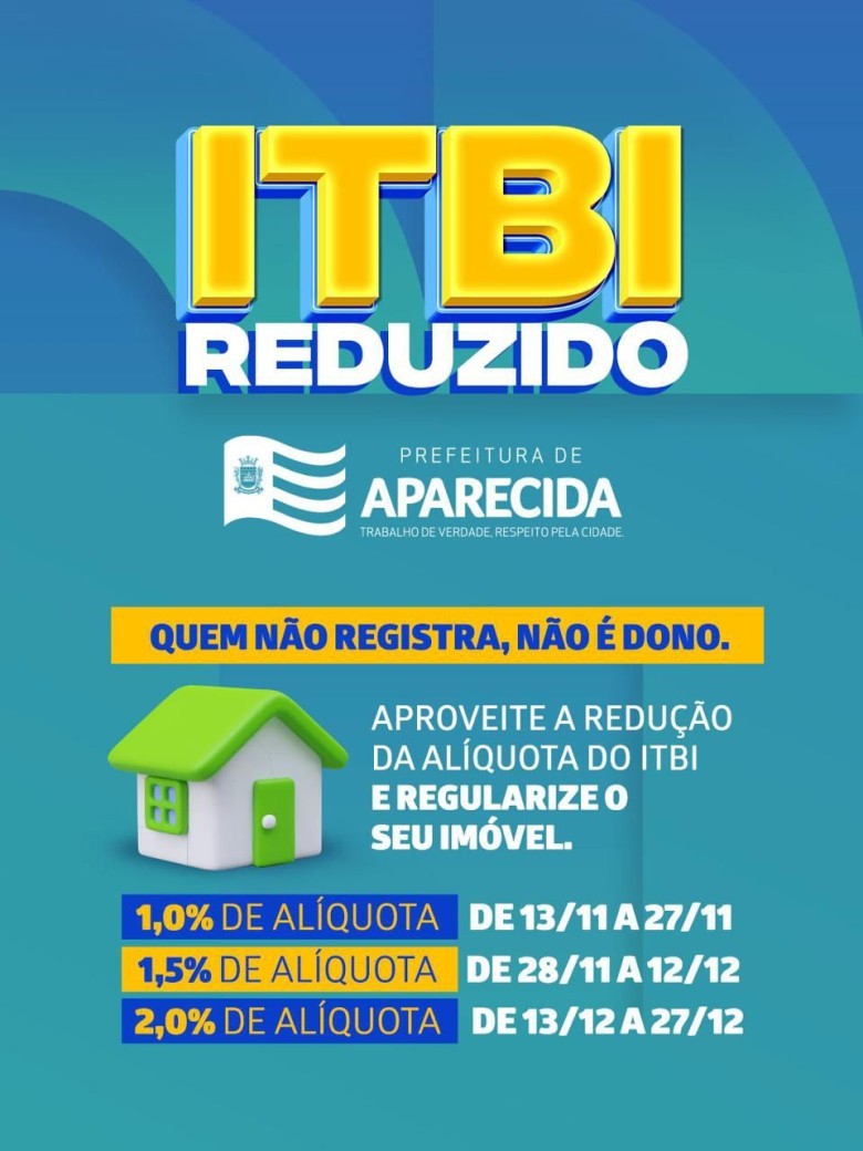 O prefeito de Aparecida de Goiânia, Leandro Vilela, sancionou e publicou no Diário Oficial Eletrônico desta quinta-feira (13) a Lei Complementar nº 246/2025, que estabelece a redução temporária das alíquotas do Imposto sobre Transmissão de Bens Imóveis (ITBI) no município. A medida tem como objetivo estimular a regularização de imóveis, aquecer o mercado imobiliário e incentivar a arrecadação espontânea.
