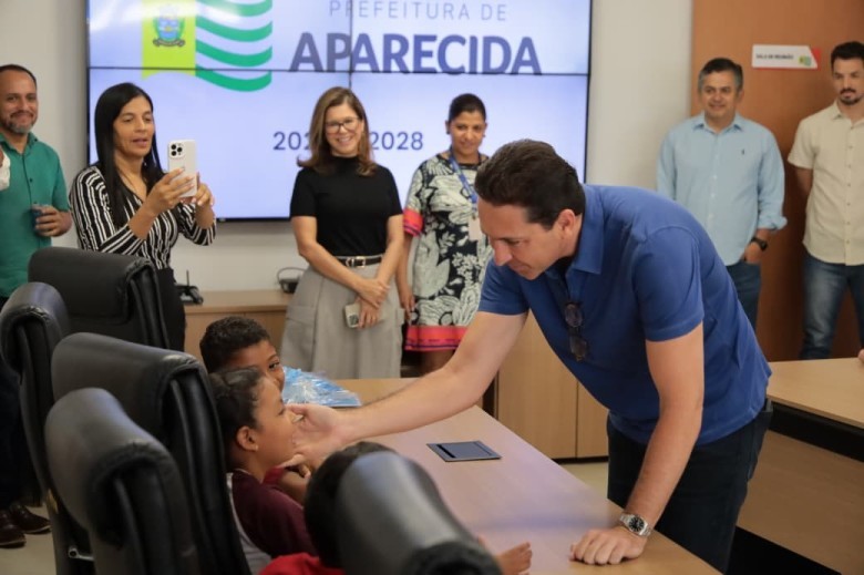 O prefeito de Aparecida de Goiânia, Leandro Vilela, recebeu na manhã desta sexta-feira (10), em seu gabinete, os alunos do 1º ano da Escola Municipal Olentino Xavier da Costa no Setor Serra Dourada. Os foram apresentar e entregar o livro “Um Mundo Melhor”, produzido coletivamente pelos estudantes sob orientação das professoras Jane Cristina e Alessandra.
