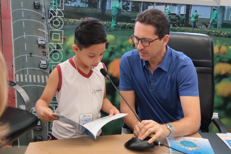 “Obrigado, prefeito, por receber a gente e por prometer pintar a nossa escola. A gente ficou muito feliz de conhecer o seu gabinete e de entregar o nosso livro ‘Um Mundo Melhor’.”