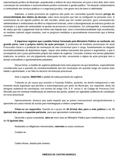 Embora reconheça a relevância do debate — sobretudo diante da existência de carreira jurídica estruturada em Caldas Novas — o juiz reforçou que o exame aprofundado da constitucionalidade das leis municipais é imprescindível antes de qualquer medida extrema, como a exoneração imediata do chefe da Procuradoria.