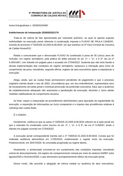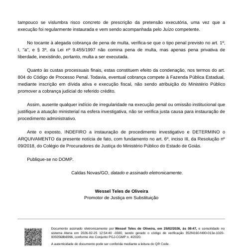 Diante desses elementos, o Ministério Público concluiu que não há indícios de inércia estatal ou ausência de atos executórios, afastando também qualquer risco concreto de prescrição.