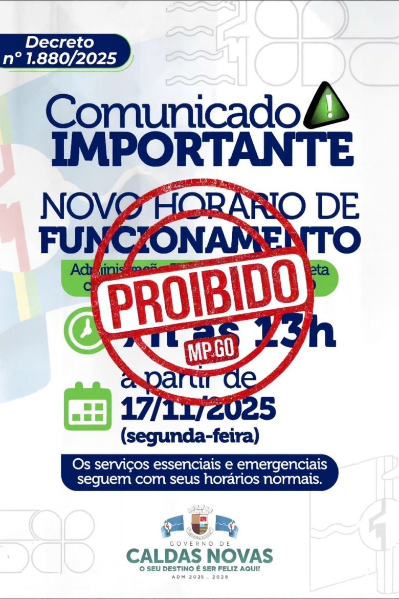 O Ministério Público de Goiás, por meio da 5ª Promotoria de Justiça de Caldas Novas, encaminhou nesta terça-feira (19/11) uma recomendação formal à Prefeitura solicitando a revogação imediata do Decreto Municipal nº 1.880/2025. O documento municipal havia instituído turno único na administração pública, das 7h às 13h, de segunda a sexta-feira, para o período entre 17 de novembro e 31 de dezembro de 2025.